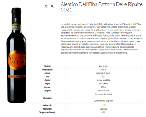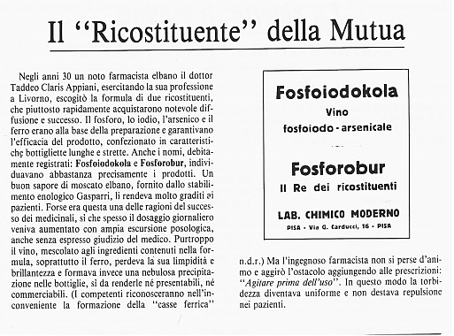 Negli anni 1930 un noto farmacista elbano, dott. Taddeo Claris Appiani mise in commercio un “ricostituente” della mutua, da lui creato, a base di fosforo, iodio, e ferro e mescolandolo con vino Moscato. Eccone il prospetto della spiegazione.articolo ricavato da una citazione dello eccellente storico elbano Aulo Gasparri. Il vino Aleatico menzionato e “figlio” del produttore originario Pier Mario Meletti Cavallari; Dopo essere migrato all'Elba e collaborato con la fattoria “Delle Ripalte”. Confido che a volte si è parlato del produrre il vino Aleatico e alla fine eccolo prodotto e perfezionato col tempo, è stata una scelta felice.