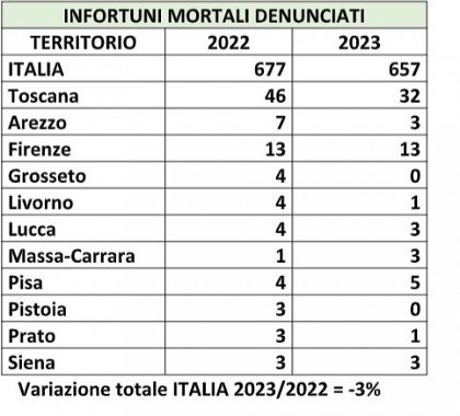 Sul fronte degli infortuni mortali invece ad Arezzo sono stati 3 quest'anno (7 nel 2022); a Firenze 13 come nel 2022; a Grosseto 0 come a Pistoia (nella prima erano stati 4 nel 2022 mentre nel capoluogo pistoiese 3), a Livorno 1 (nel 2022 erano stati 4); a Lucca 3 (uno in meno rispetto al 2022); a Prato 1 (3 nel 2022); a Siena 3 come lo scorso anno; a Massa Carrara 3 contro 1 solo dell'anno scorso ed a Pisa 5 contro (4 del 2022). In merito alle malattie professionali in diminuzione solo a Prato: -1,5%.
