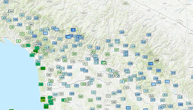 I valori più bassi si sono registrati nei fondovalle più riparati dal vento e nelle vallate più strette: Gaiole in Chianti -5.7, Palazzo del Pero -5.3, Monteroni d'Arbia -3.8, Borgo San Lorenzo -3.4, Barga -3.3, Arezzo -2.7. "Valori un po' più alti a Firenze, Pistoia, Lucca, Pisa, Grosseto, intorno a 0°, Prato 1°", enumerano i meteorolgi Lamma.
