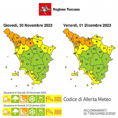 Ancora, un'allerta gialla per mareggiate interessa tutta la costa e Arcipelago, così come i rilievi appenninici per vento forte: il provvedimento si estende fino alla mezzanotte di sabato 2 Dicembre.